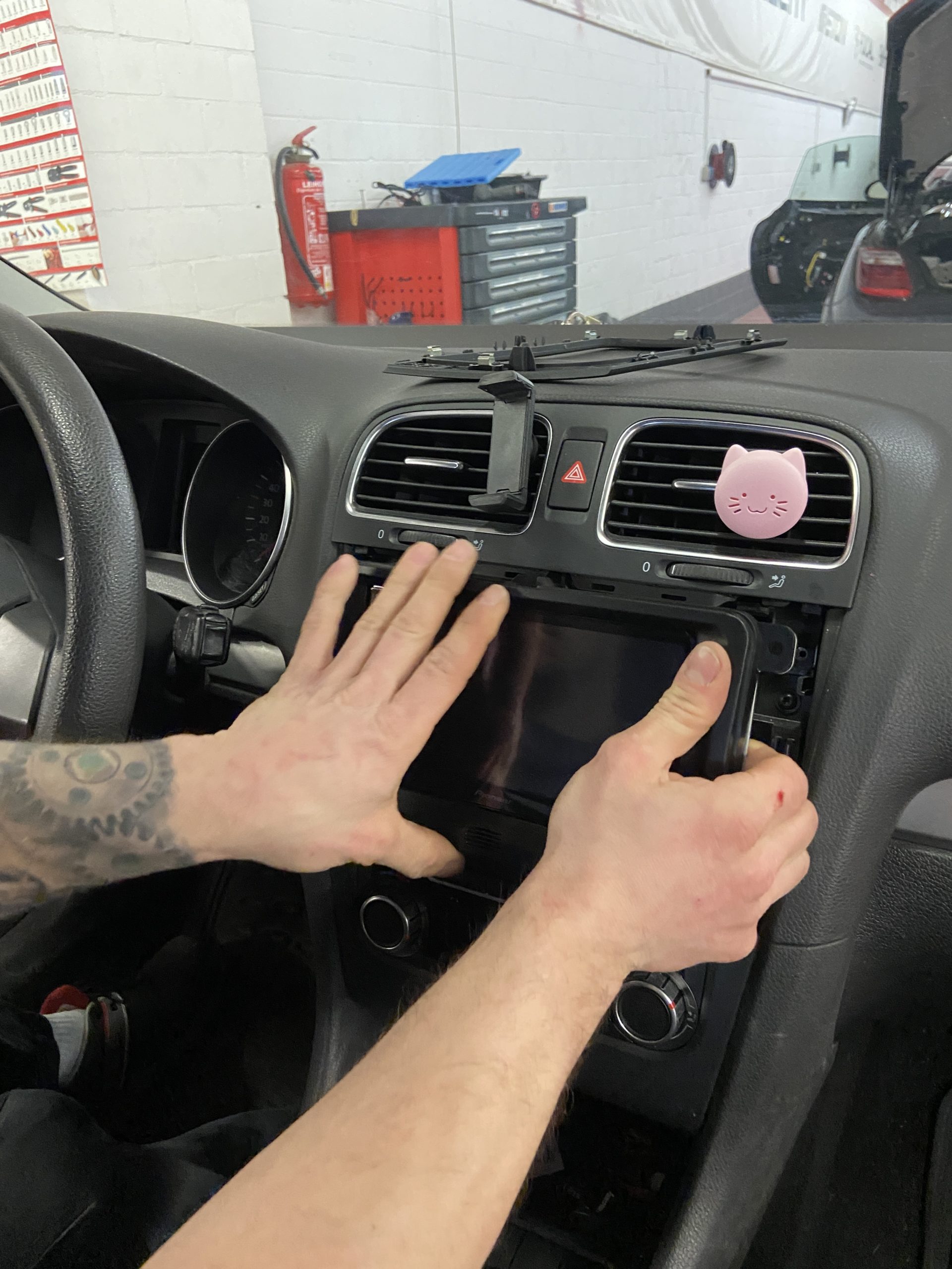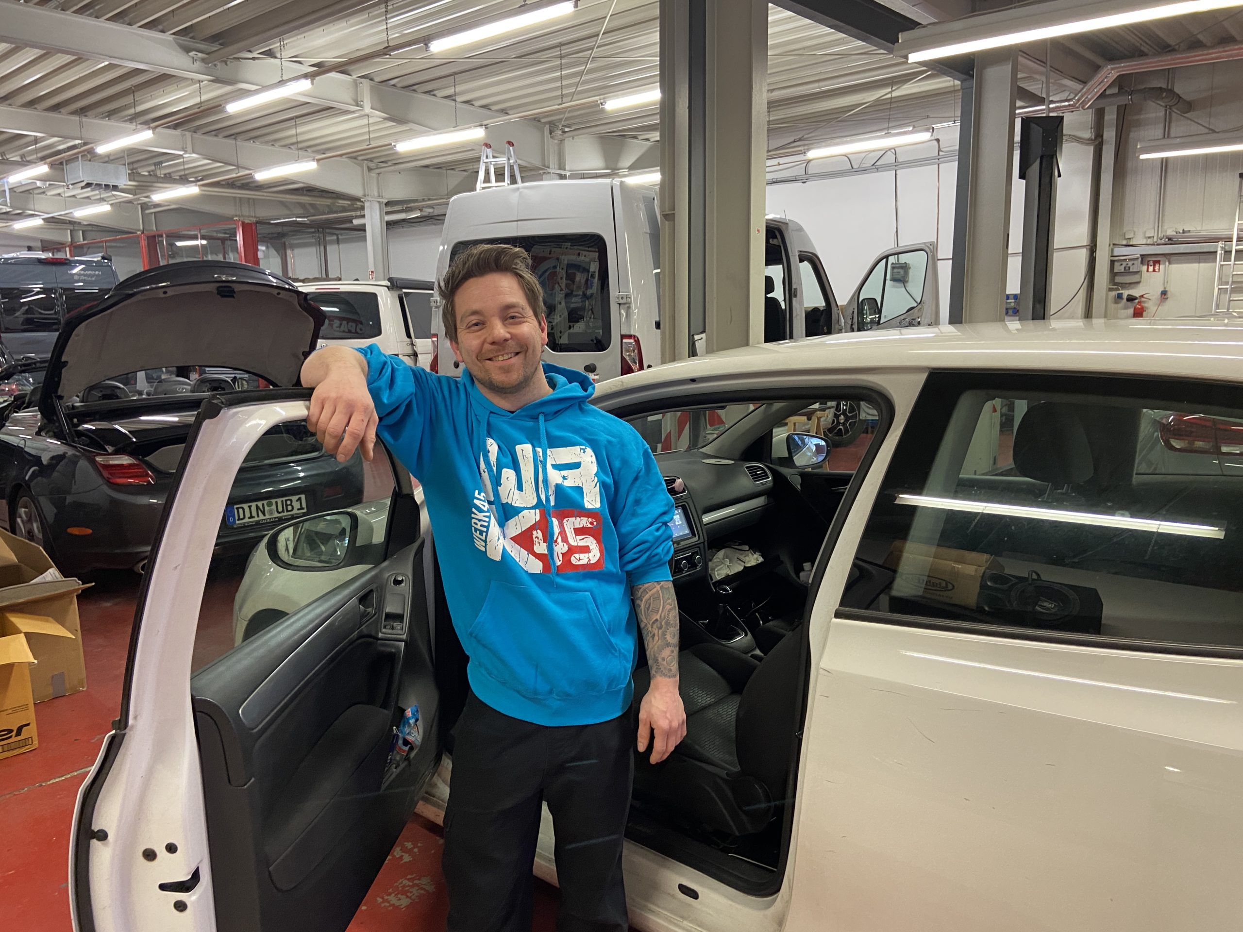Natürlich habe ich den Einbau begleitet und Euch eine kleine Fotostrecke mitgebracht. Der Hammer dabei ist Werkstattleiter René von de Dynski (36). Er ist ist nicht irgendein „Schrauber“. Er hat bei Mercedes gelernt und baut mittlerweile seit mehr als zehn Jahren HiFi, Radio und Navigationsgeräte ein.