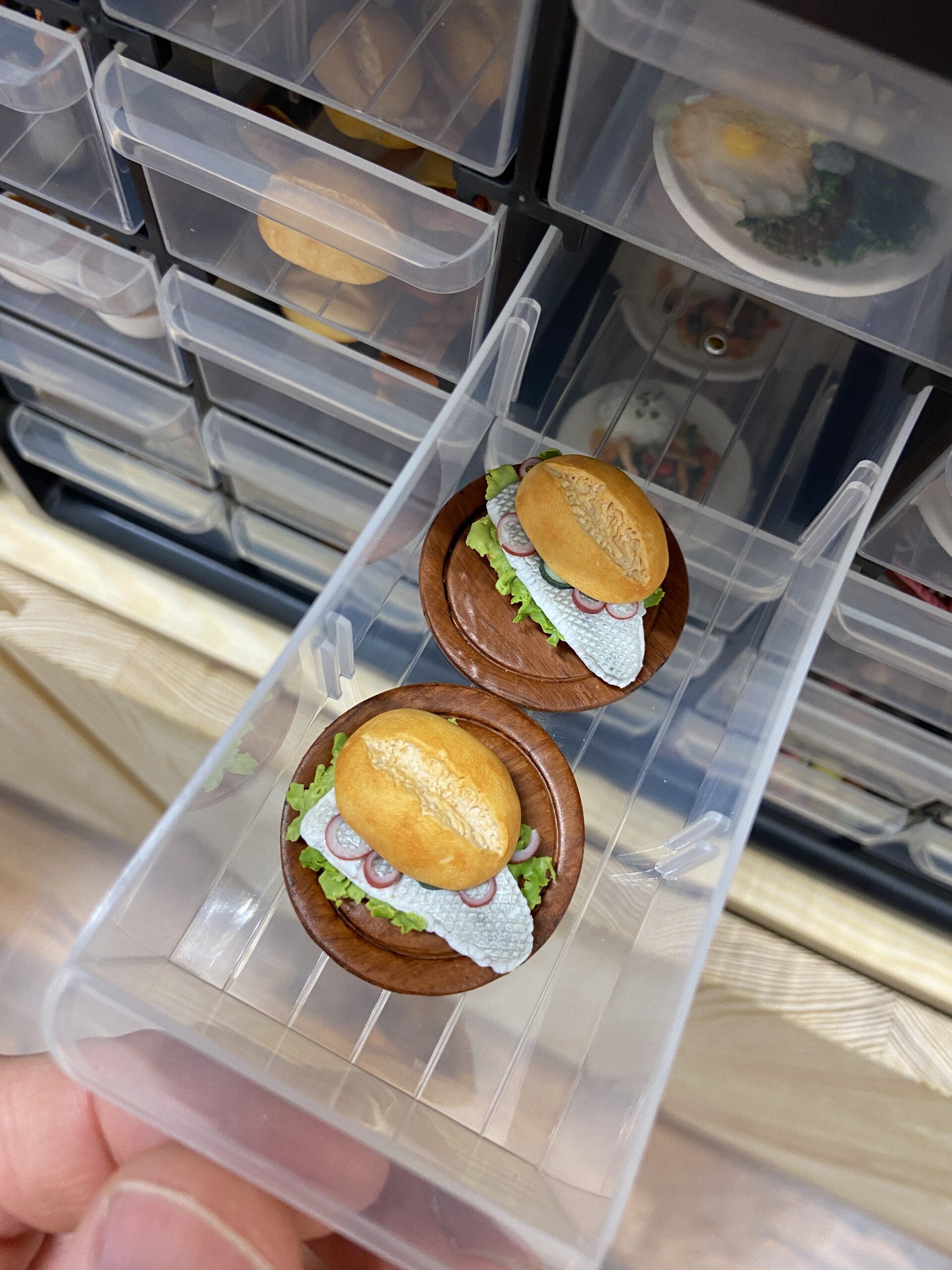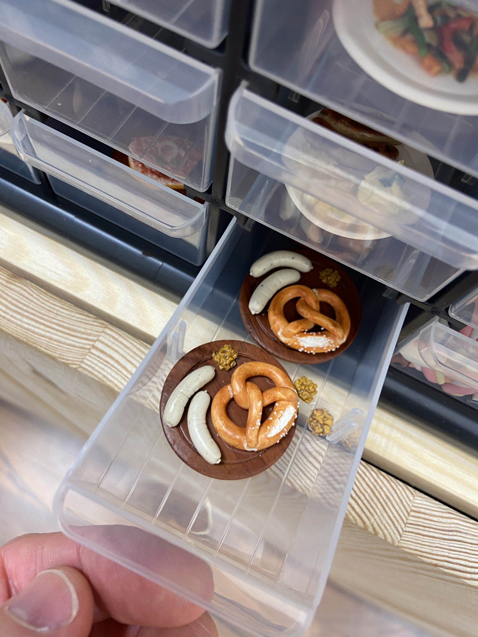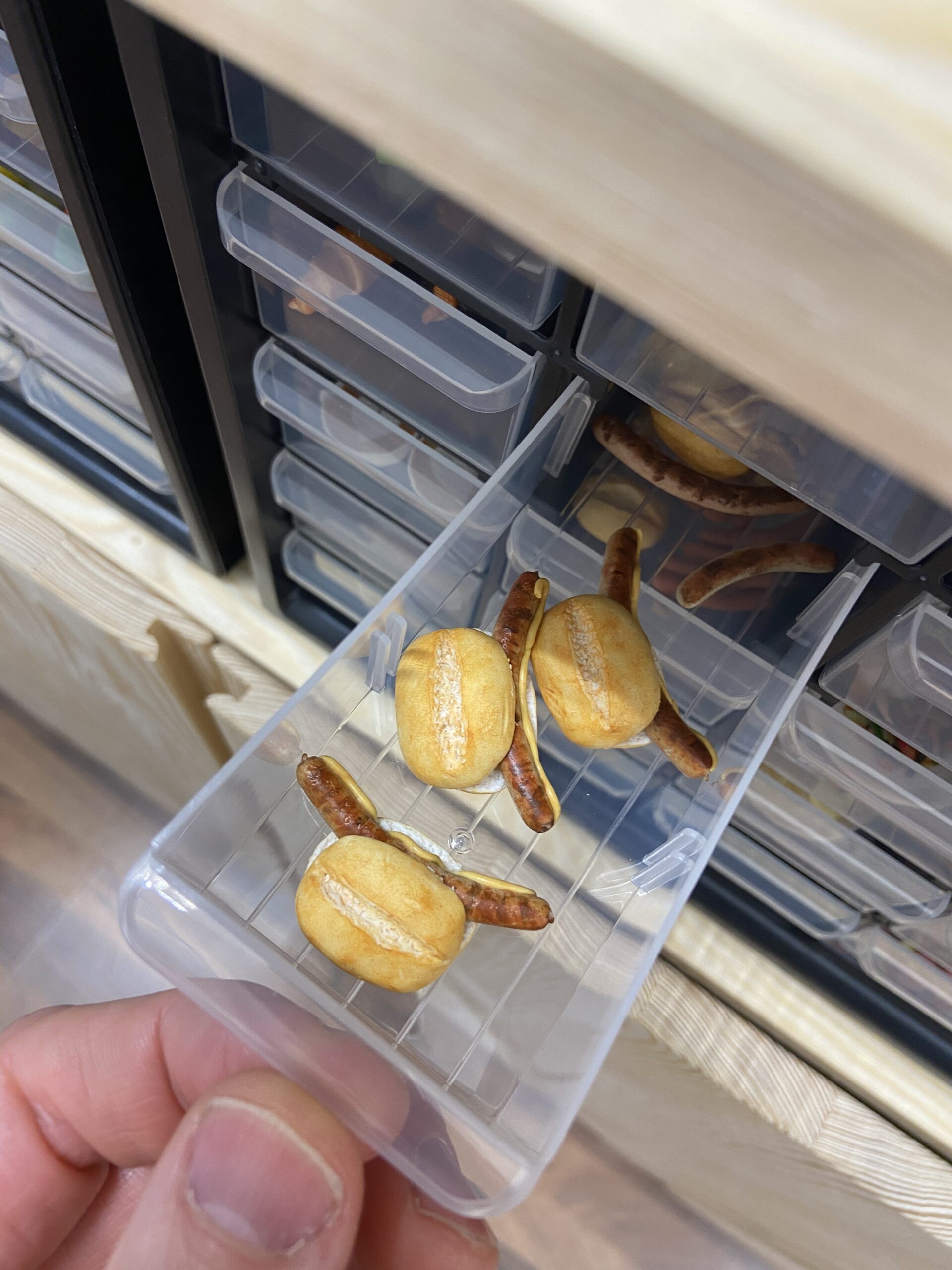 Die frühere Ergo-Therapeutin, die sich jetzt seit etwa zwei Jahren neu orientiert und fulltimemäßig selbstständig gemacht hat, backt am Ende jedes ihrer per Handarbeit erstellte „Mini-Objekt“ bei 110 Grad für genau 30 Minuten, dann sind die Bananen, Bratwürste, Nogger, Bum-Bums, Fischbrötchen, Zitronen, Melonen, Schokoladen & Co ready für die Manufaktur-Fertigstellung.