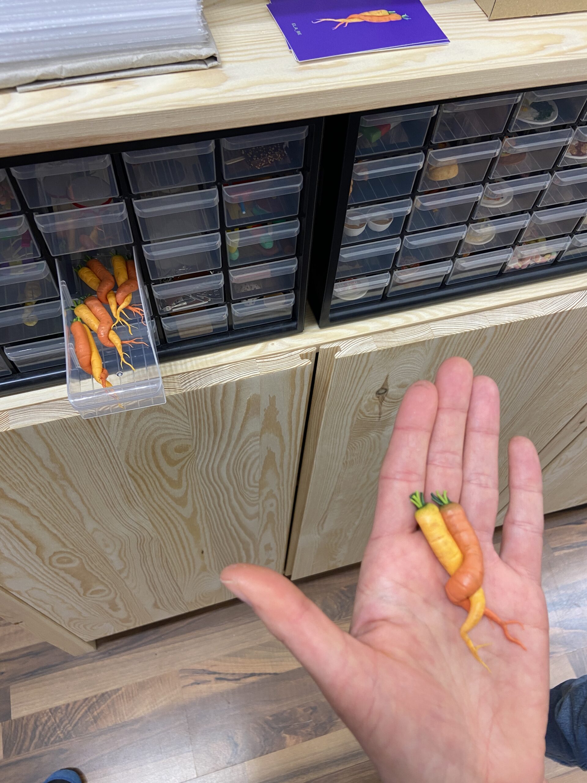 Der Clou bei der „Produktion“ der beeindruckenden Miniatur-Kunstwerke: Manuela macht sie quasi aus „Knete“. Das ist natürlich meine Laienformulierung dazu. Ofenhärtende Modelliermasse wäre korrekt, die verwendete „Kneten“-Marke ist die bekannte FIMO.