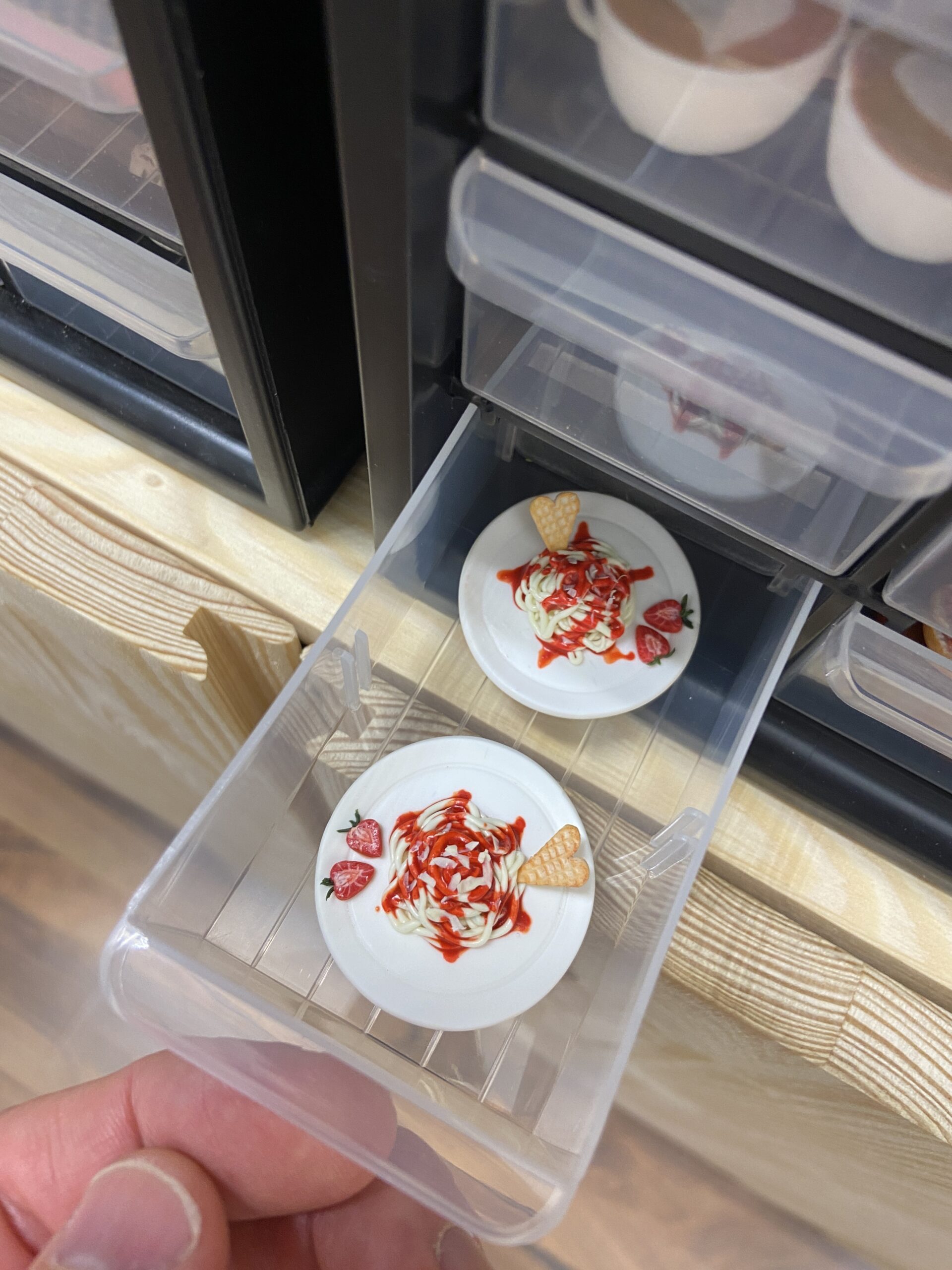 Als Manuela mir das erzählt, stellt sie mit einem stolzen, leicht verschmitzten Gesicht gleich noch eine winzige To Go-Essensschale mit einem Thai-Gericht auf den Tisch, ihre neueste Kreation; quasi eine Extrawurst = Sonderbestellung eines Kunden. „Dieses Modell wird aber nicht in Serie gehen“, verrät die junge Unternehmerin, „die Essensschale und jedes einzelne Reiskorn waren schwer zu modellieren und haben extrem viel Detailarbeit und Zeit gekostet.“
